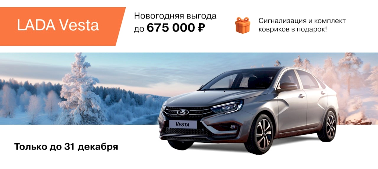 Двойная новогодняя выгода на LADA VESTA до 675 000₸. Сигнализация и комплект ковриков в PinUp